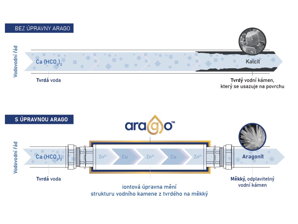 Die vom ARAGO-Gerät freigesetzten Zinkionen verursachen eine dauerhafte Veränderung der Struktur der im Wasser enthaltenen Karbonatmineralien, was deren Ablagerung verhindert. Die aufbereiteten Mineralien werden anschließend schrittweise aus dem Wassersystem ausgespült. Diese Art der Aufbereitung erhält im Wasser nicht nur alle wichtigen Mineralien, sondern auch seinen ursprünglichen Geschmack und Geruch.