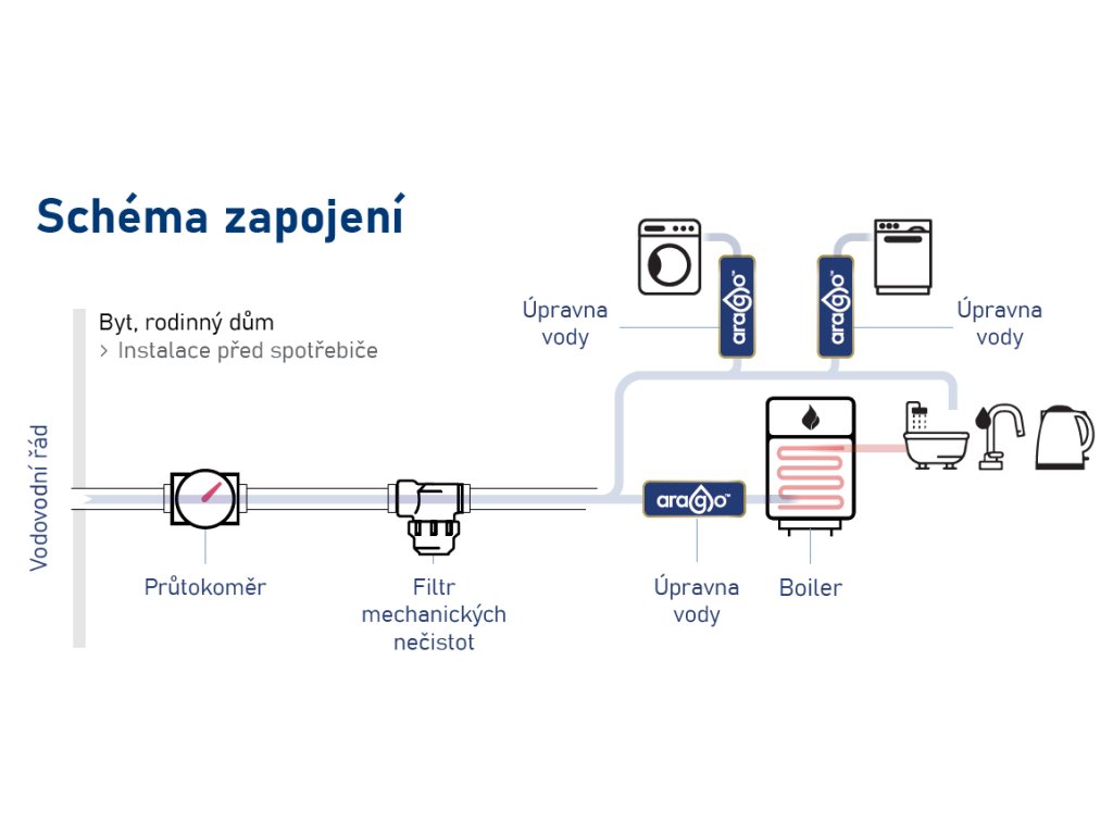 ARAGO mini ist ein Ionensystem zur Aufbereitung des Quellwassers, das die Entstehung von Kalkablagerungen verhindert. Es ist vor allem für die Installation vor Haushaltsgeräten wie Waschmaschinen, Geschirrspülern oder Boilern (Warmwasserspeichern) konzipiert. Durch seine Wirkung verlängert es die Lebensdauer dieser Geräte erheblich.
