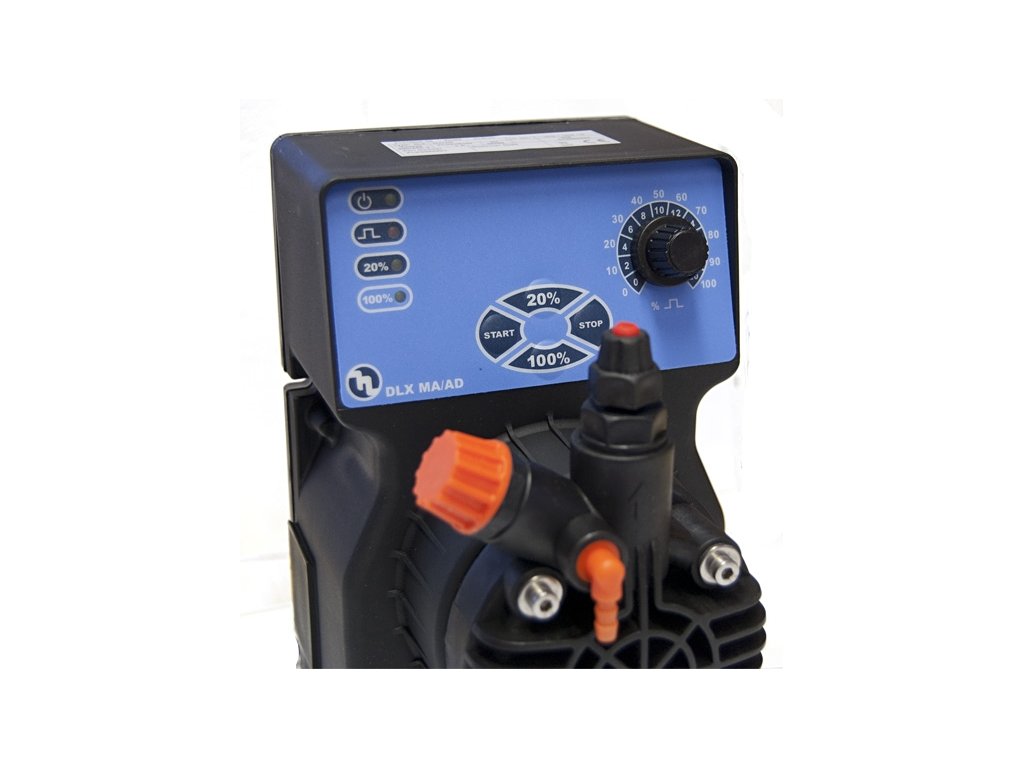 Die Dosierpumpe wird zur Entfernung von Bakterien, zur Erhöhung oder Senkung des pH-Werts, in geschlossenen Kühlsystemen zur Dosierung von Bioziden, Sulfiten oder Phosphaten verwendet. Die Installation erfolgt am Wasseranschluss. Falls ein Vorfilter benötigt wird - der Vorfilter wird immer vor der Pumpe montiert. Die Chemikalie wird durch Injektionen in das Wasser eingebracht, die je nach Wasserbelastung, Wasserdruck in der Leitung und anderen Aspekten eingestellt werden. Je höher der Druck in der Leitung ist - desto weniger Liter pro Stunde werden in das Wasser injiziert - die Injektionen müssen diesen Wasserdruck überwinden. Mit einem Drehknopf stellen Sie die Leistung der Pumpe gemäß der ausgewählten Skala von 0 bis 100 % und 0 bis 20 % ein.
