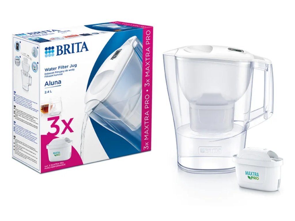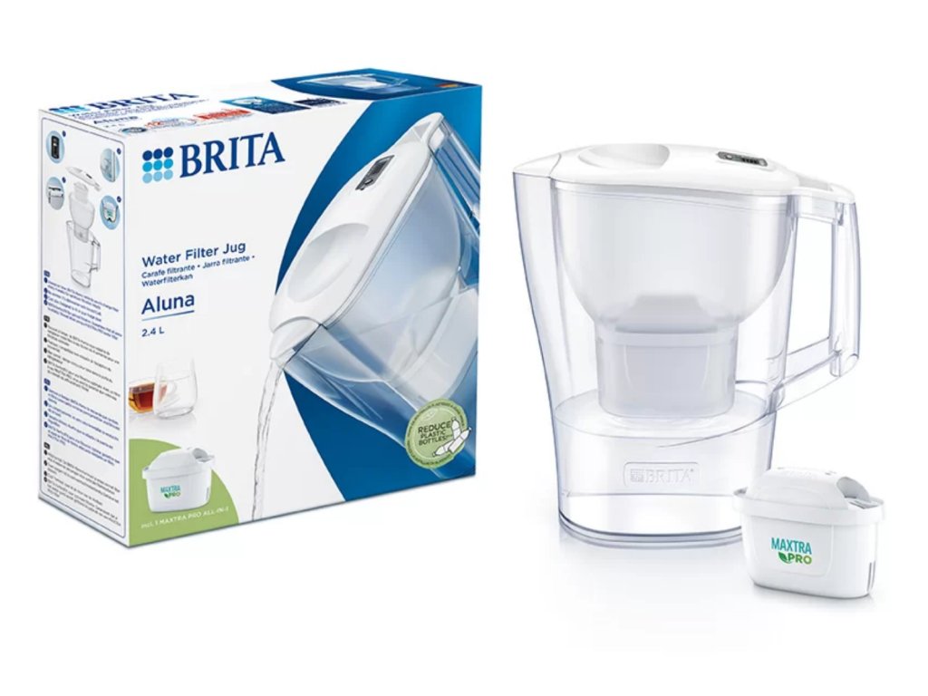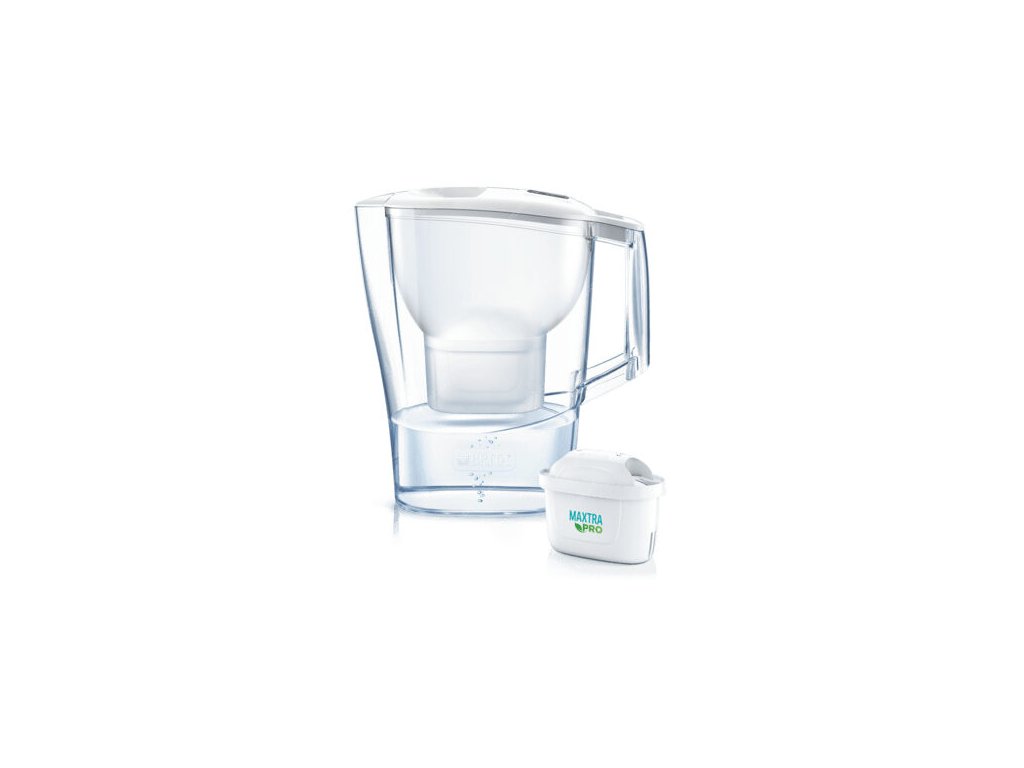 Filterkanne Brita Aluna mit einem Gesamtvolumen von 2,4 l. Dank des aufklappbaren Deckels einfach zu befüllen und ausgestattet mit einer Filterwechselanzeige. Erhältlich in der weißen Variante.