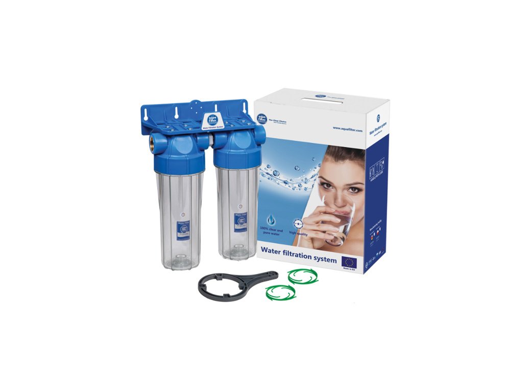 Das Filterset DUO verbindet zwei transparente Kunststoffgehäuse zum Einsetzen beliebiger Filtereinsätze in der Größe 10". Das transparente Filtergehäuse ermöglicht eine einfache visuelle Kontrolle der Verschmutzung des Filtereinsatzes. Dieses Set ist für die mechanische Filtration vorgesehen (befreit das Wasser von Sand, Schlamm, Schwebeteilchen, Rost usw.). Der Entlüftungsknopf ermöglicht ein einfaches Entfernen der Luft nach dem Austausch des Einsatzes.
