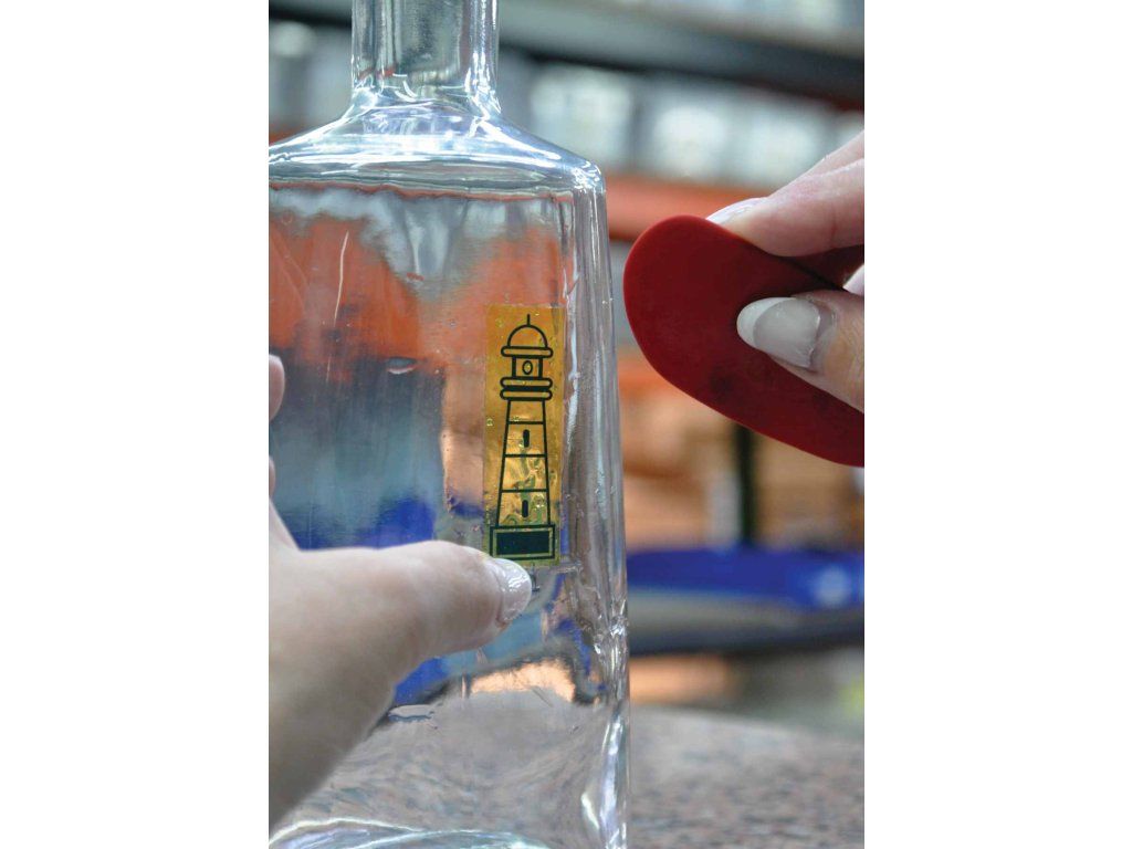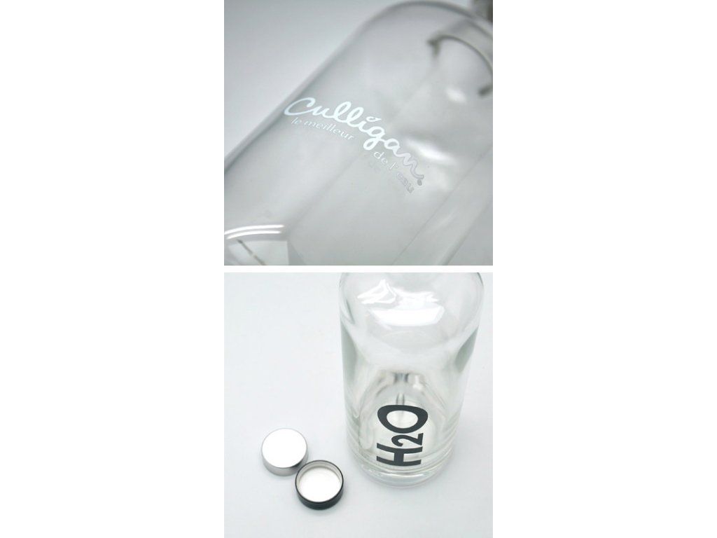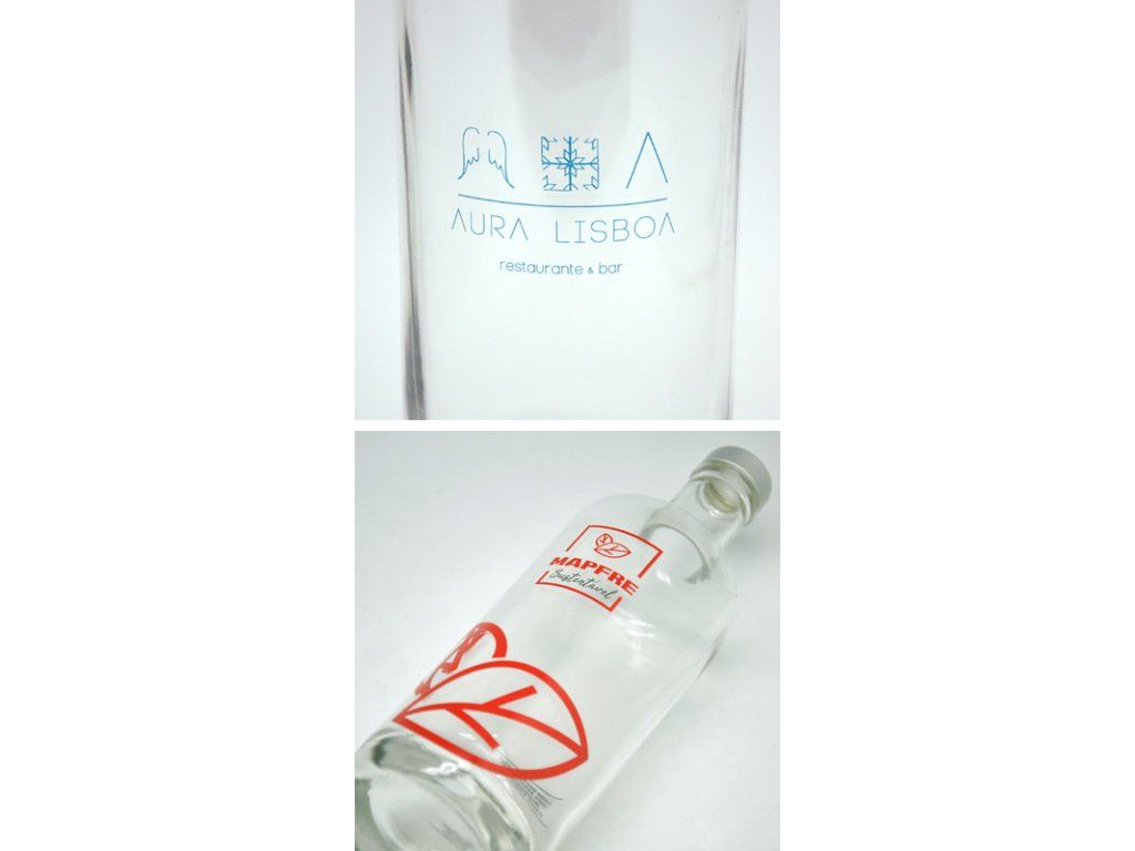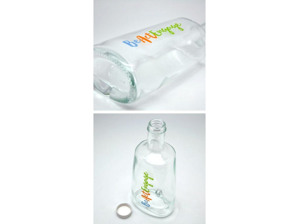 Verpackung von wiederverwendbaren Karaffen mit individuellem Aufdruck. Die Anbringung des gewünschten Bildes/Logos erfolgt mittels Siebdruck-Transfer, gedruckt mit Direktfarben. Das Bild wird anschließend auf das Glas übertragen und bei hoher Temperatur eingebrannt, wodurch eine lange Lebensdauer und Qualität des Aufdrucks gewährleistet ist.