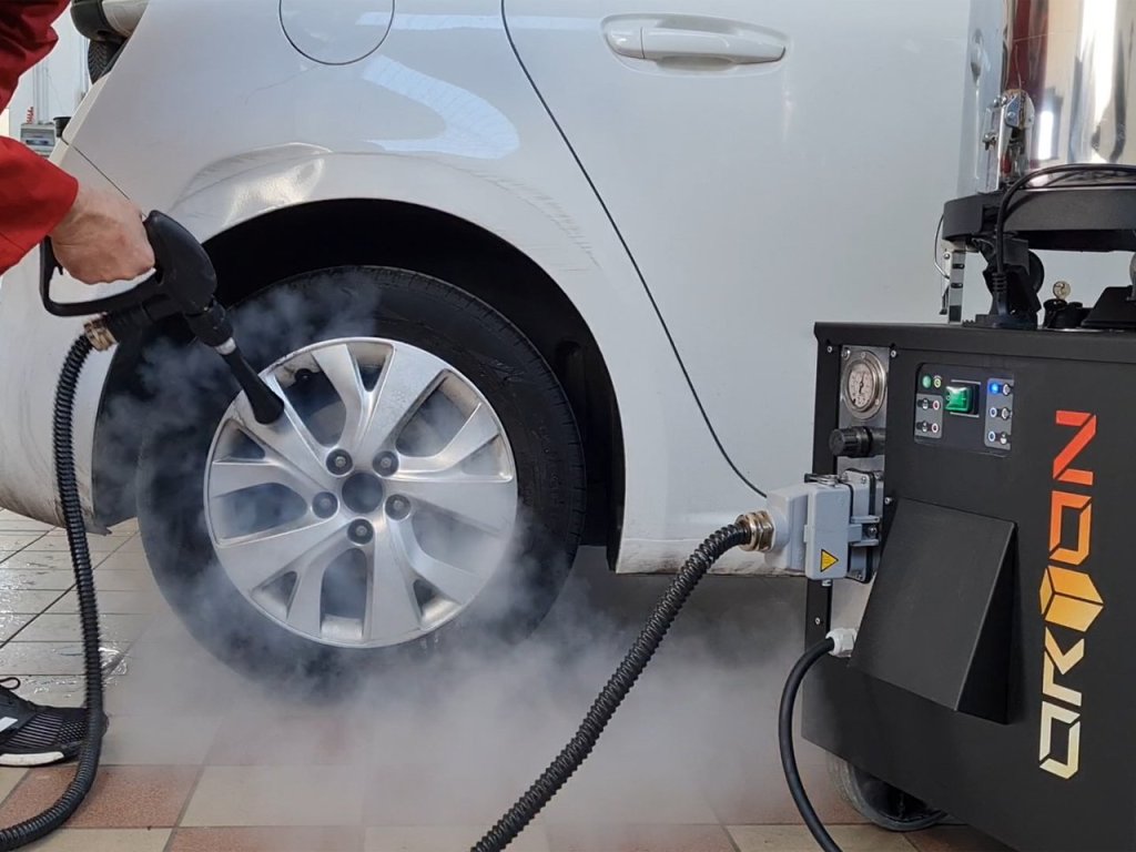 Reinigung des Autos mit einem Dampfreiniger.