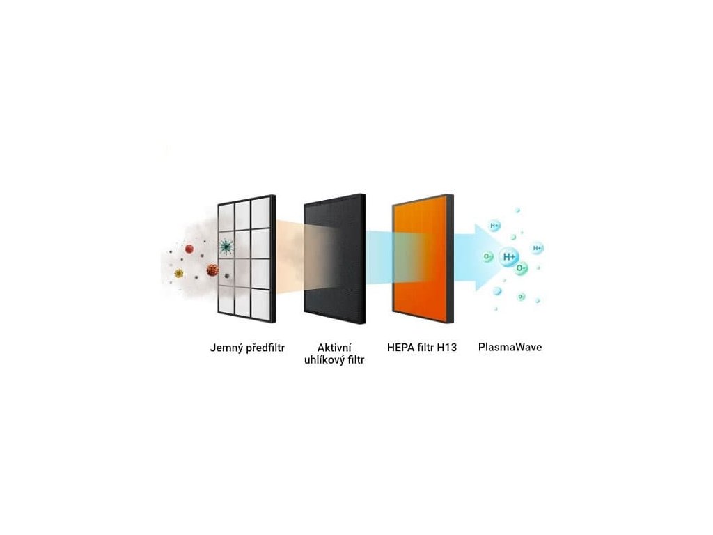 - Vierstufige Filterung mit 99,999 % Effizienz: waschbarer Vorfilter, HEPA H13, AOC™ Filter mit Aktivkohle, PlasmaWave®.
