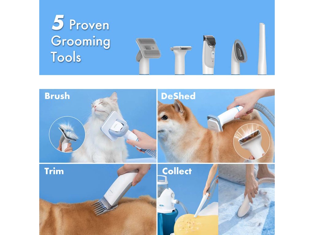 Das Set mit Staubsauger enthält fünf verschiedene Aufsätze. Eine Fellpflegebürste, ein DeShedding-Trimmkamm, eine elektrische Haarschneidemaschine, eine Fugendüse und eine Bürstendüse für einfache Reinigung.