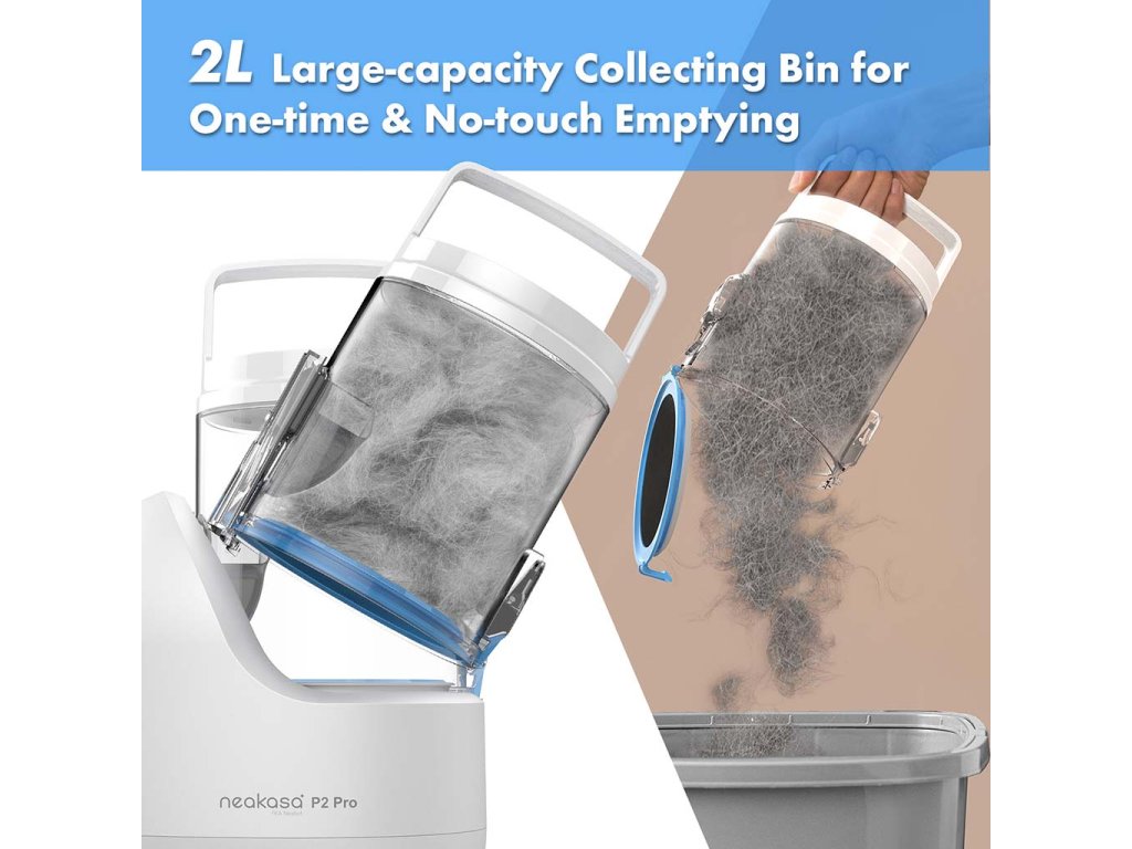 Das Neakasa P2 Pro Fellpflege-Set für Hunde und Katzen ist so konzipiert, dass es automatisch Haare und Fell beim Bürsten und Schneiden Ihres Haustieres in einen auswaschbaren Kunststoffbehälter saugt. Das Fell fällt nicht überall herunter, sondern wird direkt in den Staubsaugerbehälter gesaugt. Das Neakasa P2 Pro hilft, das Zuhause immer sauber und aufgeräumt zu halten.