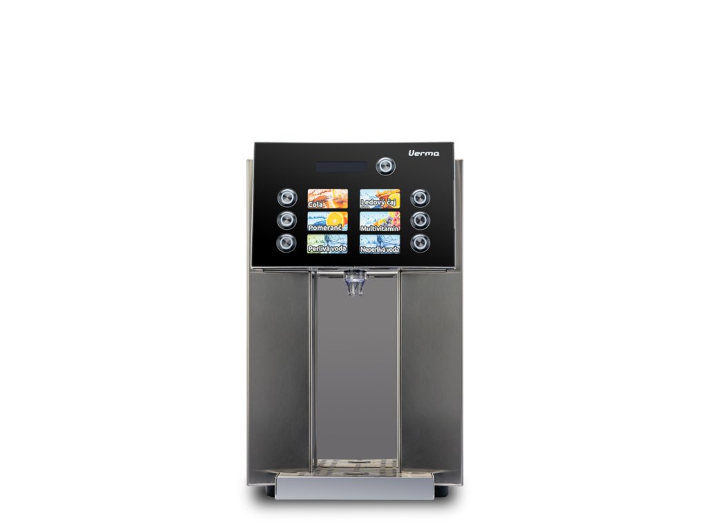 Der Getränkespender AQUAVER 4SD mit Edelstahlgehäuse ist ein Gerät zum Zapfen von vier Sorten Limonaden/Säften sowie gekühltem oder Sodawasser. Es eignet sich für die Verwendung von Sirupkonzentraten in Kanistern und Bag-in-Boxen. Der AQUAVER 4SD wird über Tasten auf einem modernen Glaspanel mit Display bedient. Der Anschluss für Wasser, Sirupe und CO2 befindet sich am Boden des Zapfgeräts und ist somit von jeder Seite zugänglich.