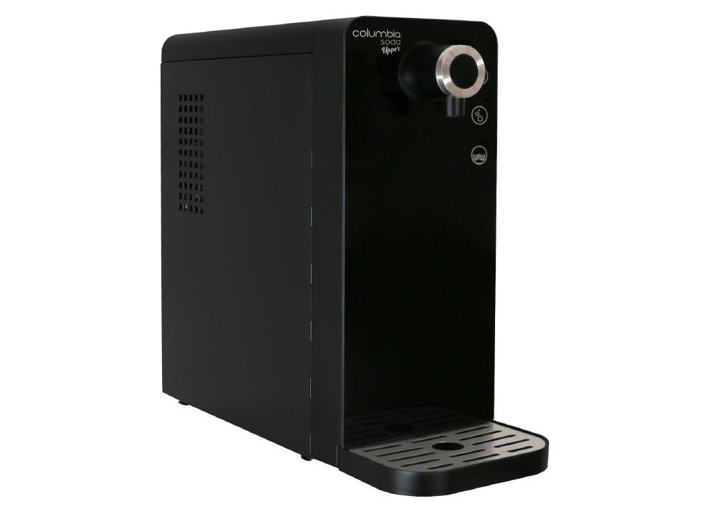 Kompakter Sodobar COLUMBIA SODA UPPER in schwarzer Farbe, besonders geeignet für Büros, Haushalte und Sportumgebungen. Er bereitet einfach Wasser mit Raumtemperatur, kaltes Wasser oder kaltes Sprudelwasser zu.