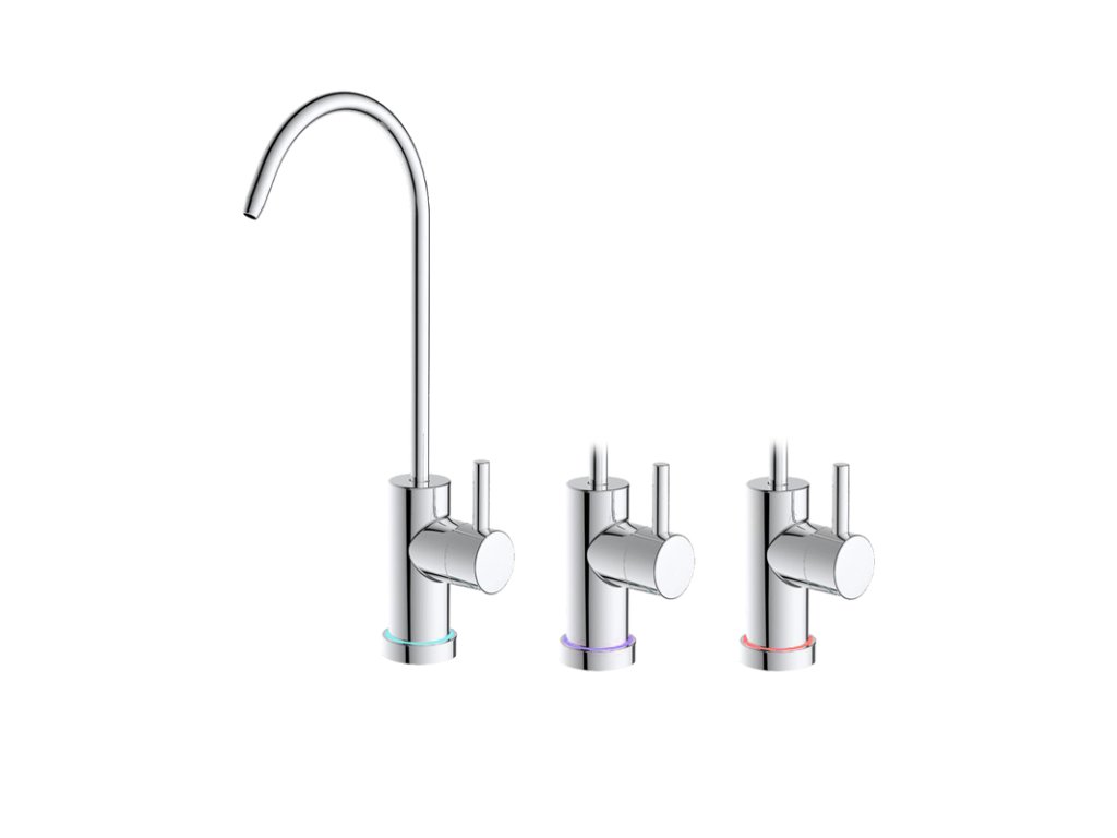 Der Auslass für gefiltertes Wasser wird durch einen modernen Wasserhahn mit Anzeige für den Filterwechselbedarf gewährleistet, der im Lieferumfang enthalten ist. Das aufbereitete Wasser sammelt sich in keinem Behälter und ist daher immer absolut frisch. Die farbige Lichtanzeige symbolisiert den Zustand der Filterkartuschen. Wenn es blau leuchtet, ist die Filtrationseffizienz optimal und es sind keine Wechsel erforderlich. Wenn es violett leuchtet, nähert sich die Lebensdauer des Filters dem Ende und ein Wechsel des Einsatzes wird bald erforderlich sein. Falls es anfängt rot zu leuchten, ist ein Wechsel der Filterkartusche erforderlich. |