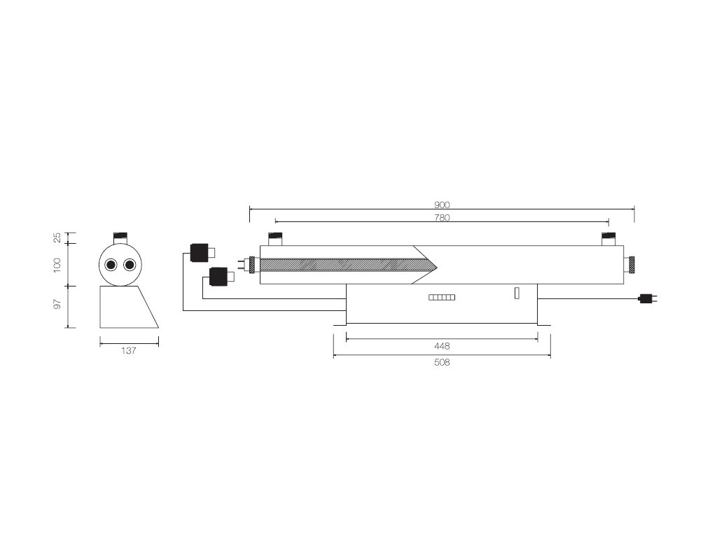 Für einen einfachen Austausch der Ersatz-Leuchtstofflampe ist Platz in mindestens der Länge der UV-Lampe in Richtung des Ausbaus der Ersatz-Leuchtstofflampe erforderlich. Zum Entfernen des Quarzrohres muss die Mutter am entgegengesetzten Ende des Trafos gelöst werden. Daher ist es wichtig, dass es leicht zugänglich ist.