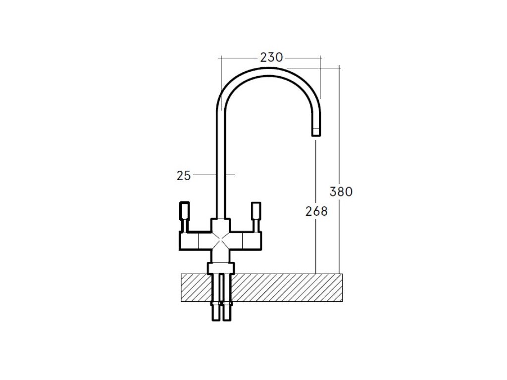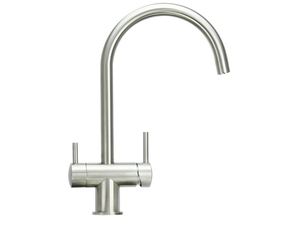 Dreifach-Wasserhahn für gefiltertes und Leitungswasser (warm und kalt). Das gefilterte Wassersystem befindet sich in einem Arm, wo es durch einen eigenen Wasserauslass vom Warm- und Kaltwasser getrennt ist.