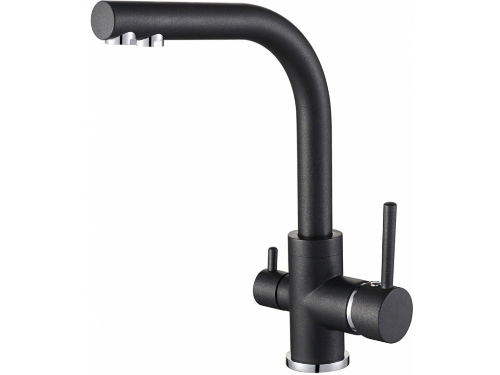 Dreifach-Wasserhahn für gefiltertes und Leitungswasser (warm und kalt). Das gefilterte Wassersystem befindet sich in einem separaten Arm, wo es von heißem und kaltem Wasser getrennt ist und einen eigenen Wasserauslass hat. Im Wasserhahn sind zwei Keramikkartuschen und ein Perlator integriert, der Wasser spart. Im Lieferumfang sind auch die Anschlusskomponenten enthalten.