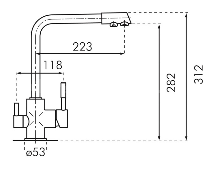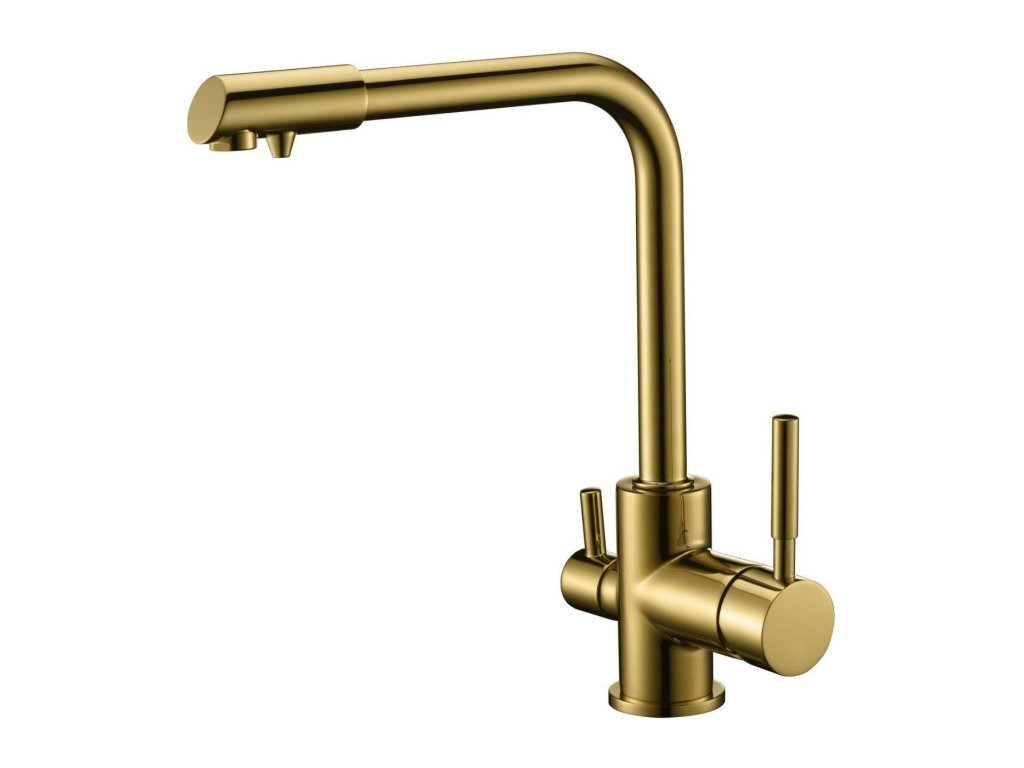 Dreiwege-Wasserhahn für gefiltertes und Leitungswasser (warm und kalt). Das System für gefiltertes Wasser befindet sich in einem separaten Auslauf, getrennt vom Warm- und Kaltwasser. Der Wasserhahn verfügt über zwei eingebaute Keramikkartuschen und einen Perlator, der Wasser spart. Anschlusskomponenten sind ebenfalls im Lieferumfang enthalten.