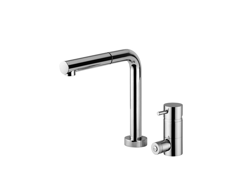 Der AQUA Wasserhahn hat entweder nur einen oberen schwenkbaren Auslauf, in dessen Inneren sich eine weitere separate Leitung für gefiltertes Wasser befindet, oder es befindet sich ein kleinerer Auslauf am Wasserhahn unter dem oberen Auslauf, der nur als Quelle für reines AQUA Wasser dient und zusätzlich eine elegante Bedienung hat.