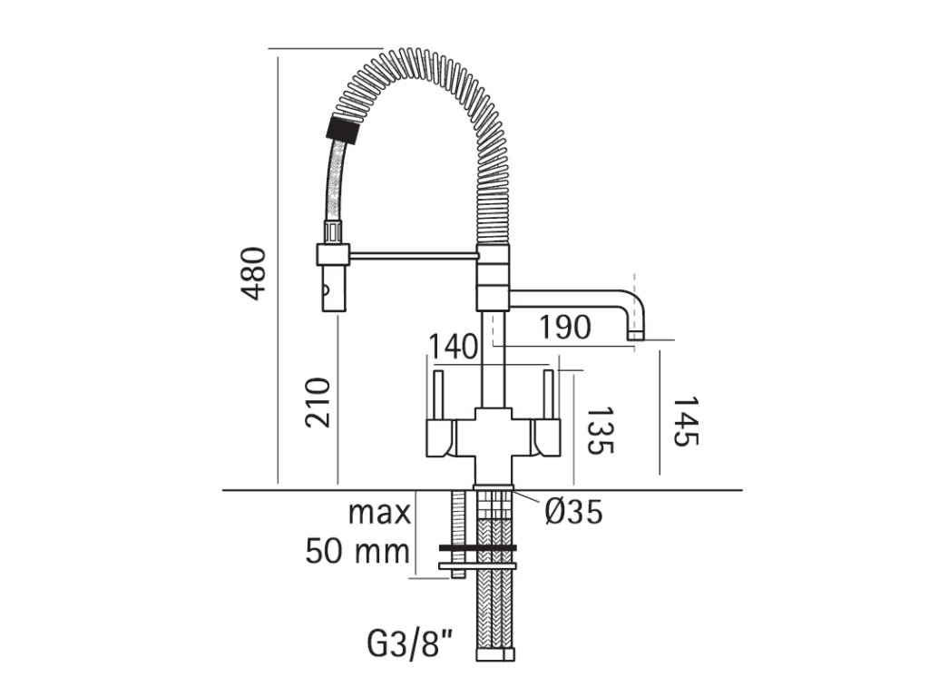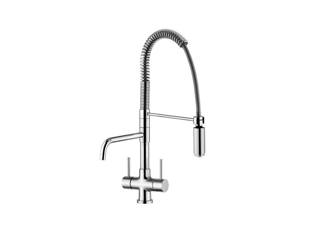Wasserhähne aus der IDEAQUA-Serie zeichnen sich durch Originalität und Qualität aus, die Sie in Ihrer Küche willkommen heißen werden. Der Wasserhahn ist aus Chrom. Das gefilterte Wassersystem wird in einem Arm geführt, wo es getrennt von heißem und kaltem Wasser mit seinem eigenen Arm für die Ausgabe von gefiltertem Wasser ist. Ein Teil des Schlauches mit kaltem und warmem Wasser wird durch eine Feder geführt, um die Handhabung beim Reinigen zu erleichtern, und dank des Federsystems können Sie den Wasserhahn beliebig handhaben. Es ist eine kleinere Version des Wasserhahns AQUA IDEAQUA 5 für kleinere Bereiche am Spülbecken.