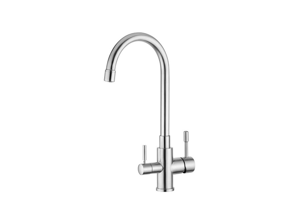 Der AQUA Wasserhahn hat entweder nur einen oberen schwenkbaren Auslauf, in dessen Inneren eine weitere separate Leitung für gefiltertes Wasser verläuft, oder am Wasserhahn befindet sich noch ein kleinerer Auslauf unter dem oberen Auslauf, der nur als Quelle für reines AQUA Wasser dient und zusätzlich eine elegante Bedienung hat.