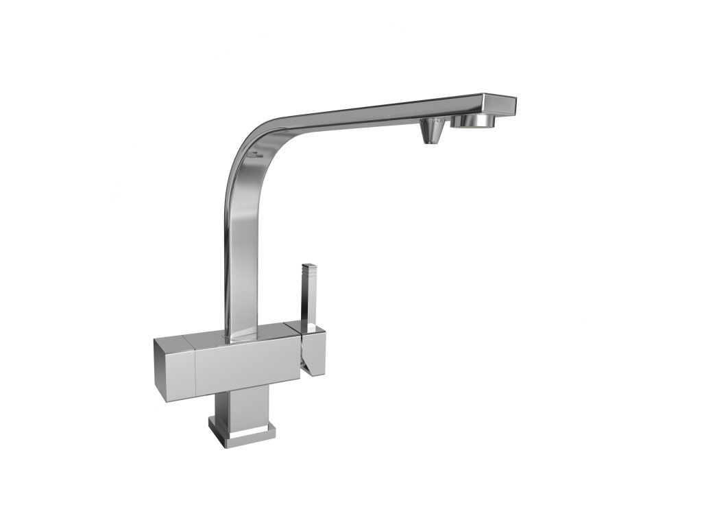 Der Wasserhahn QUADRO ermöglicht Ihnen das komfortable Zapfen von kaltem, warmem und gefiltertem Wasser. Prinzip: Der QUADRO Wasserhahn verfügt nur über einen oberen schwenkbaren Auslauf, in dessen Inneren sich eine weitere separate Leitung für gefiltertes Wasser befindet. Gefiltertes Wasser kann durch Drehen des Ventils entnommen werden. Siehe Beschreibung zur Bedienung des Wasserhahns unten. Richtung des Ventildrehens zur Entnahme von gefiltertem Wasser. 1. Gefiltertes Wasser. 2. Warmes Wasser. 3. Kaltes Wasser. 4. Ventil für gefiltertes Wasser. 5. Hebelventil zur Wasserentnahme. Vorteile: Der Anschluss des QUADRO Wasserhahns unterscheidet sich nicht von den standardmäßig verwendeten, sodass der Austausch kein Bohren in Spüle oder Küchenarbeitsplatte erfordert.Zusätzliche Parameter