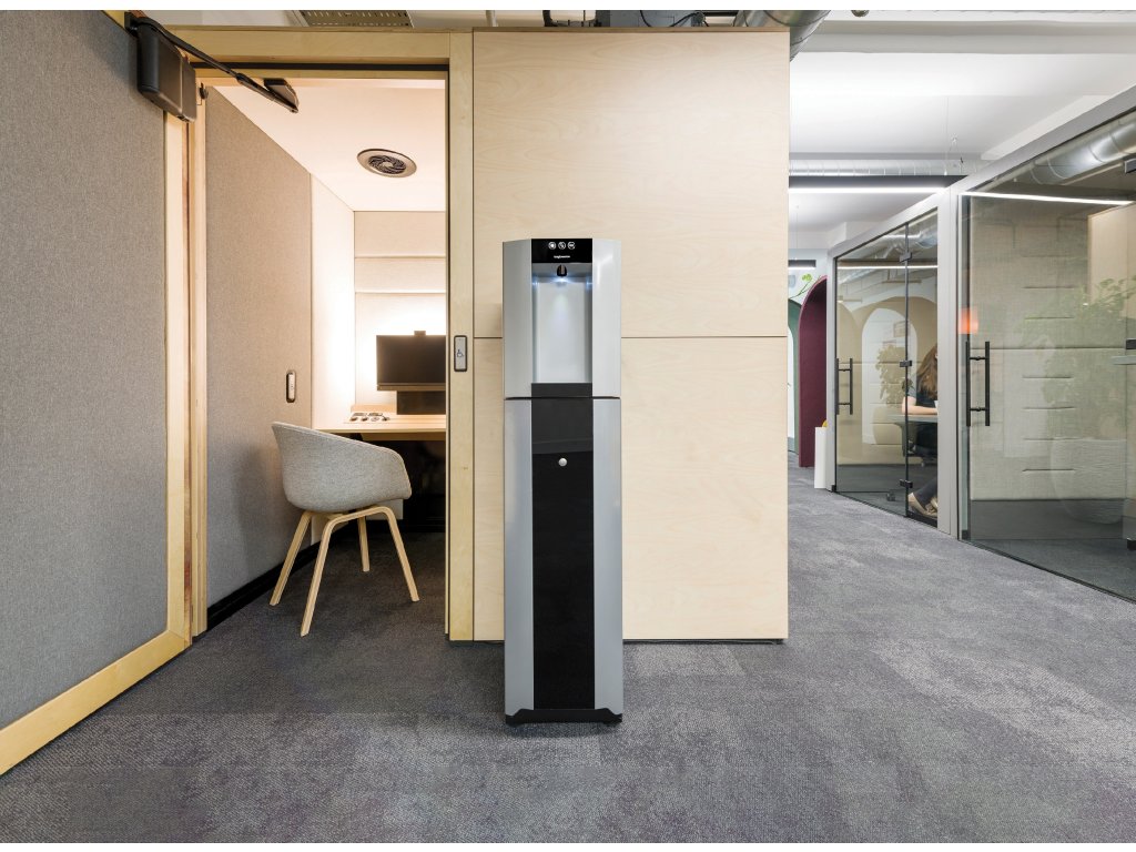 Dispenser Classic E4 mit Anschluss an die Wasserleitung verbindet hohe Leistung mit ausgezeichneter Nachhaltigkeit und Sauberkeit ohne Kunststoffe. Dank der einzigartigen Kühltechnologie mit ökologischem Kältemittel ProCore® und DryChill® bietet der E4 eine grünere Lösung für hervorragend schmeckendes gefiltertes Wasser. Kohlefiltration dient dazu, reines, gesünderes und Premium-Wasser zu erhalten. Sie reduziert Ablagerungen, Gerüche, Chlor und Mikroplastik im frisch gefilterten Wasser. Dank der Möglichkeit der kontaktlosen Steuerung über Bluetooth® wird das Kontaminationsrisiko reduziert. Die Leistung des Geräts beträgt 50 l/h kaltes oder sprudelndes Wasser und 15 l/h heißes Wasser.